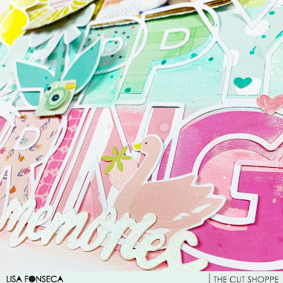 I finished my layout by adding a mix of embellishments and some stamping. I placed stars, hearts and butterflies on the patterned paper, following the burst pattern. I love mixing different embellishments to add texture and dimension to my layouts. For a final touch, I used the January All the Things stamp set to add some phrases to the layout. I really liked the contrast of the black ink with the pops of color from the January products.