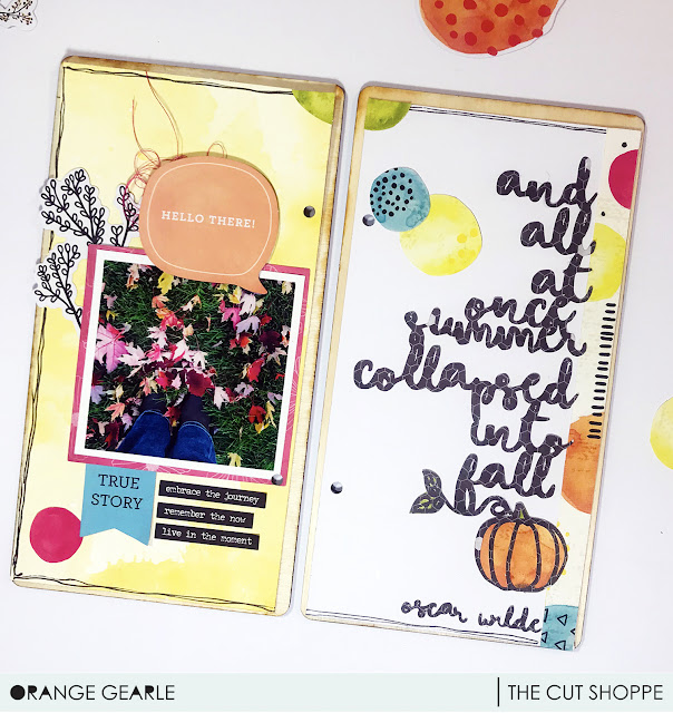 I have a couple of favorite fall quotes, and The Cut Shoppe has them both covered (my other favorite can be found here). For this layout, I thought I would go with some fall colors. But then I saw the photo with these bright papers from Vicki Boutin's Field Notes, and there was no going back!