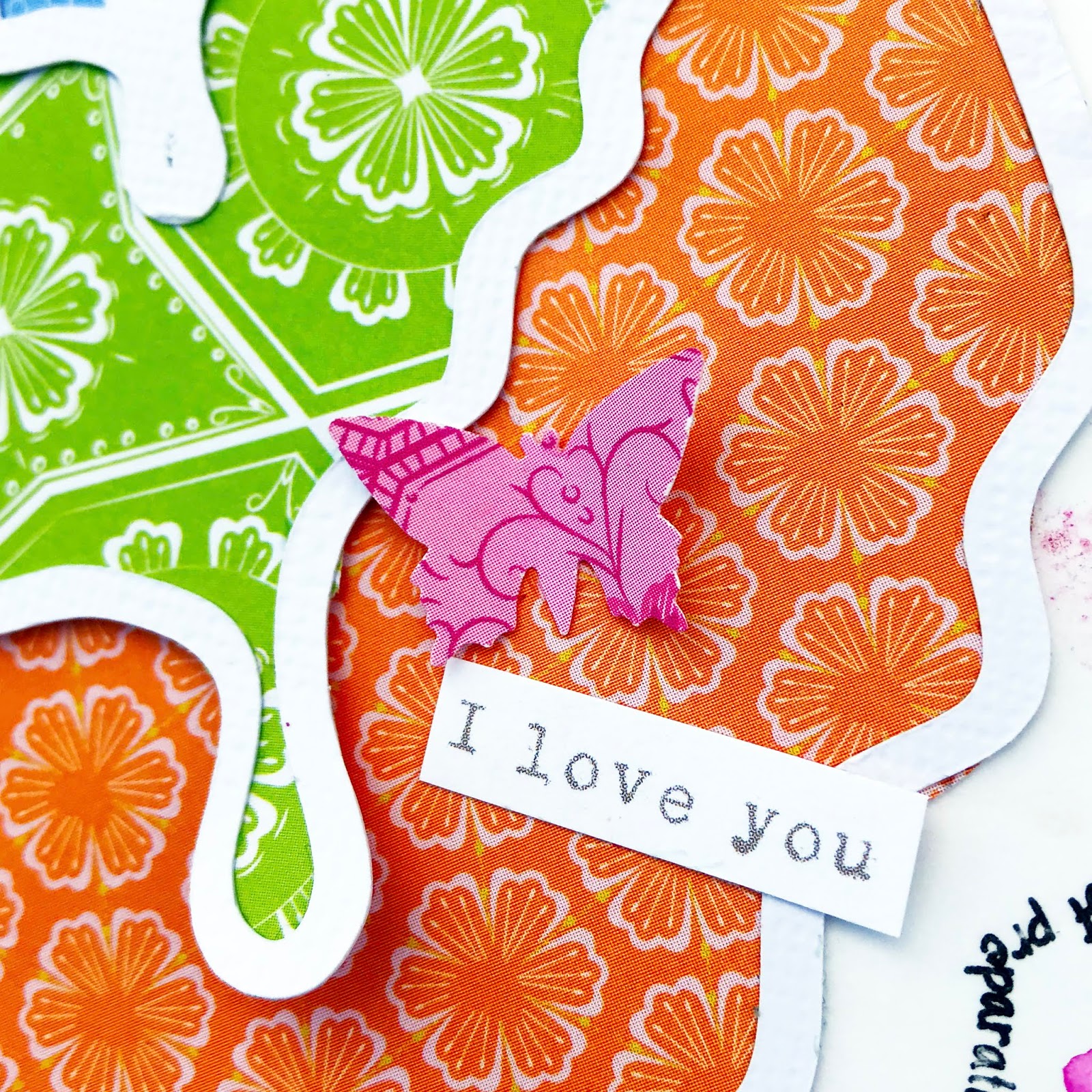 I backed the file with pretty papers and then used a punch to punch out some small butterflies and added those across the page. For the punched butterflies I used the same papers and a couple of 6x8 papers from the collection. The phrases came from a 12x12 paper also included in the collection.